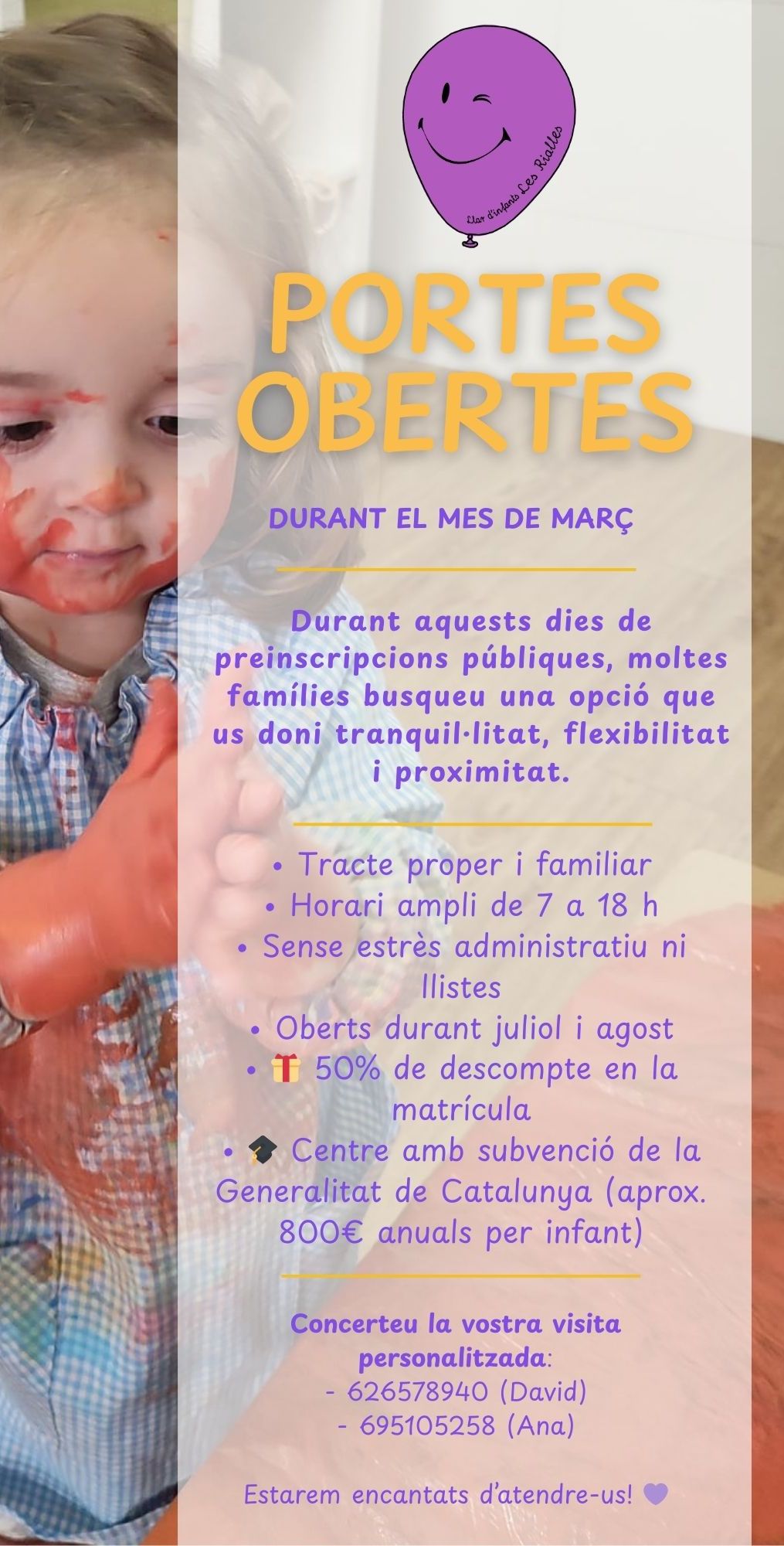 Les portes obertes són una oportunitat per descobrir de prop el nostre funcionament, resoldre dubtes i entendre com treballem per afavorir el desenvolupament integral dels infants en un entorn segur, afectiu i estimulant.